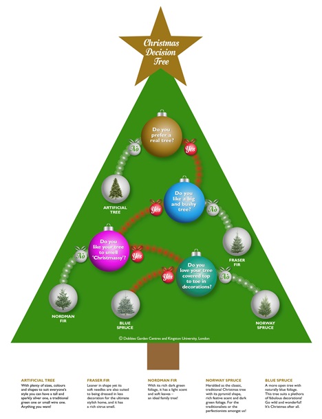 Математик із Кінгстонського університету Гордон Хантер розробив інструкцію, яка допоможе покупцеві зрозуміти, яка саме різдвяна ялинка йому потрібна.Для того, щоб знайти свою ідеальну ялинку, необхідно відповісти всього на кількапитань. Починається тест з питання про те, яку саме ялинку шукає потенційнийпокупець - живу або штучну. У разі, якщо відповідь на запитання «Ви віддаєте перевагунатуральній ялинці?» виявляється негативним, тест завершується: ідеальнимсвятковим деревом стає штучна ялина. Однак якщо покупець зацікавлений у придбаннісправжньої ялинки, він переходить до наступного питання, що стосується зовнішнього вигляду дерева.